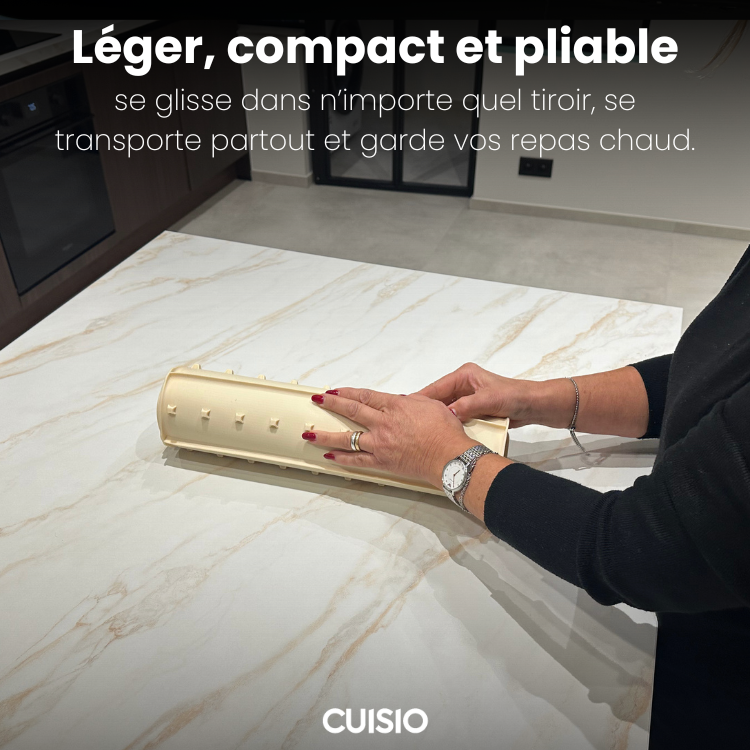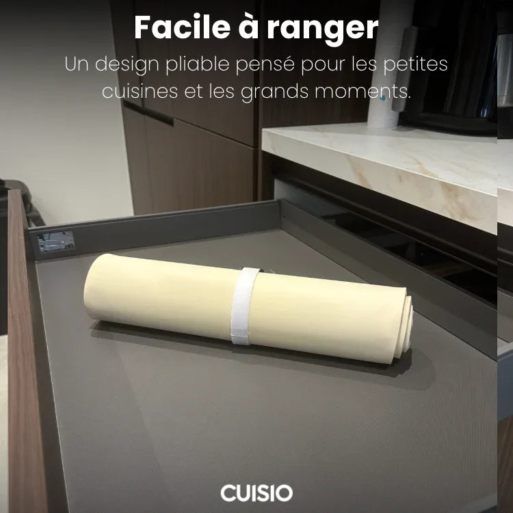 Souple et pliable, il se roule et se range facilement dans un tiroir ou un placard. Un chiffon humide suffit pour le nettoyer.