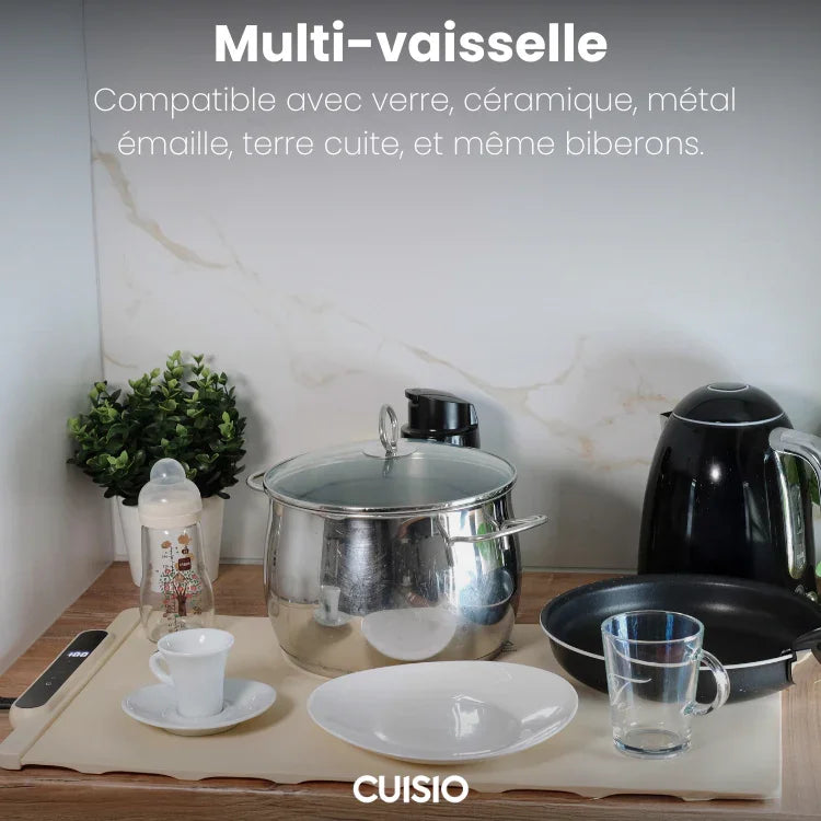 Le chauffe-plat Cuisio supporte la plupart des plats du quotidien : assiettes, bols, plats en céramique, verre, inox ou émail.