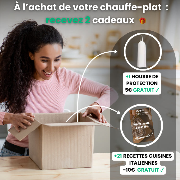 À l’achat de votre chauffe-plat Cuisio, on ne vous livre pas qu’un produit… On vous gâte avec 2 cadeaux exclusifs 🎁 :